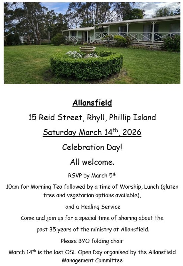 We also acknowledge that this news may bring sadness and a sense of loss for many. Places like Allansfield carry deep personal and spiritual memories, and it is natural to grieve when a place of refuge and encounter comes to an end. We hold all who are grieving this loss in prayer, trusting that the God who met people at Allansfield continues to meet us wherever we are, and that the fruits of this ministry will endure in the lives it has touched.